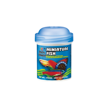 Pro’s Choice® Miniature Fish-Crumbles Rich granules in three different colors provide a nutritionally balanced food for mini-tropical fish, as essential to healthy growth and color enhancement. An ideal food for surface and mid-water feeding does not cloud the water if fed properly.